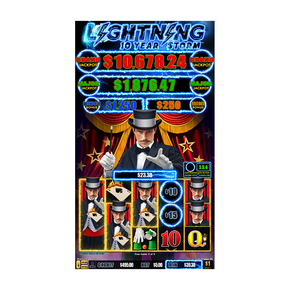 Lightning Strikes Twice! A storm 10 years in the making brings the latest additions to the Lightning Link family, with an all-new Lightning Free feature! Discover these thunderous games and experience the storm as you try your chance at the legendary Hold & Spin. As thunder booms on, you’ll meet new characters like Shang Jin Warrior and the Master Magician. Explore the world of Lightning 10 Year Storm, now available at your local casino!